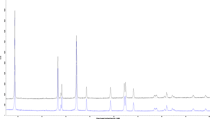 三元材料的XRD谱图(黑色为普通测量模式数据,蓝色的是去荧光模式数据)